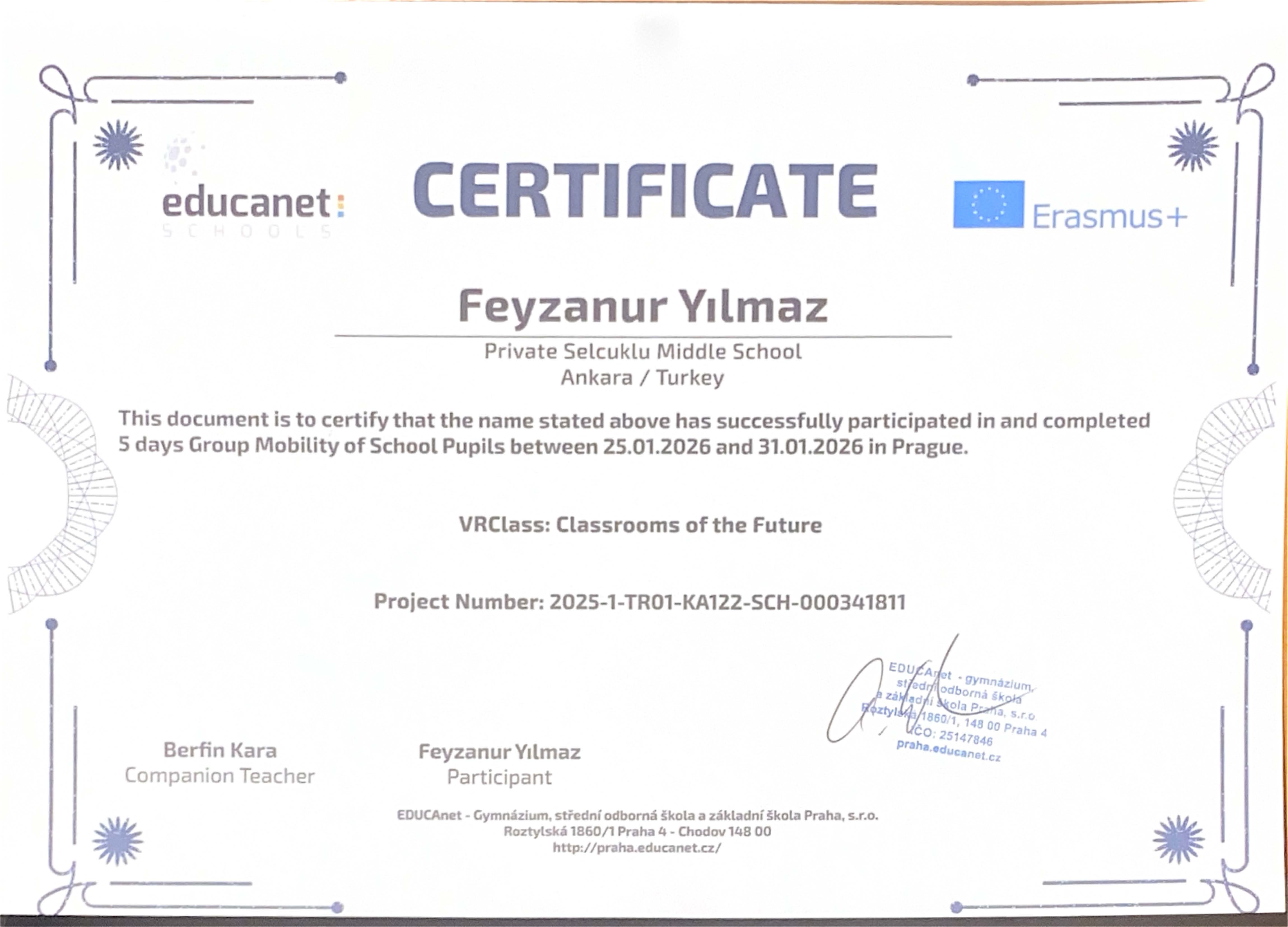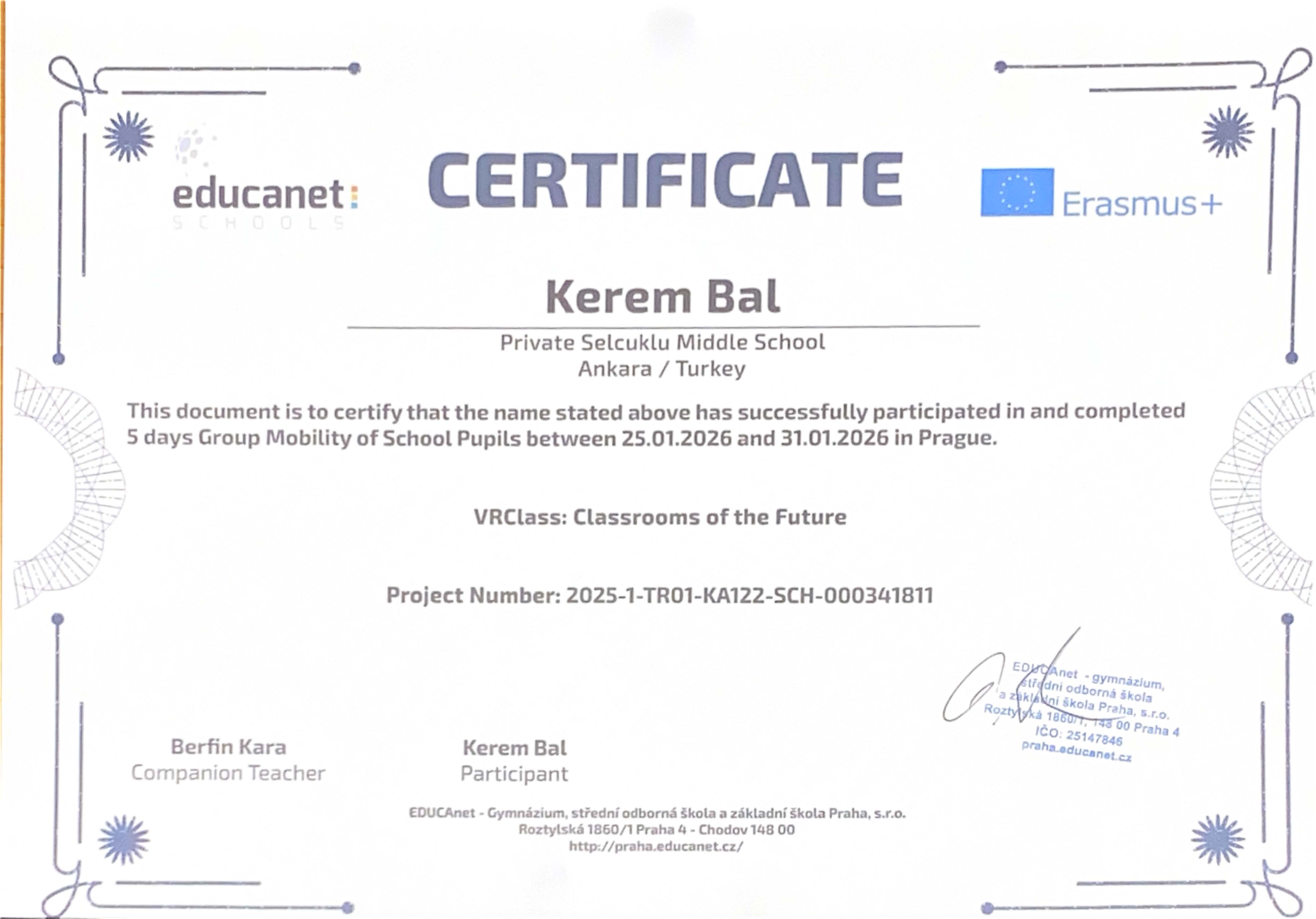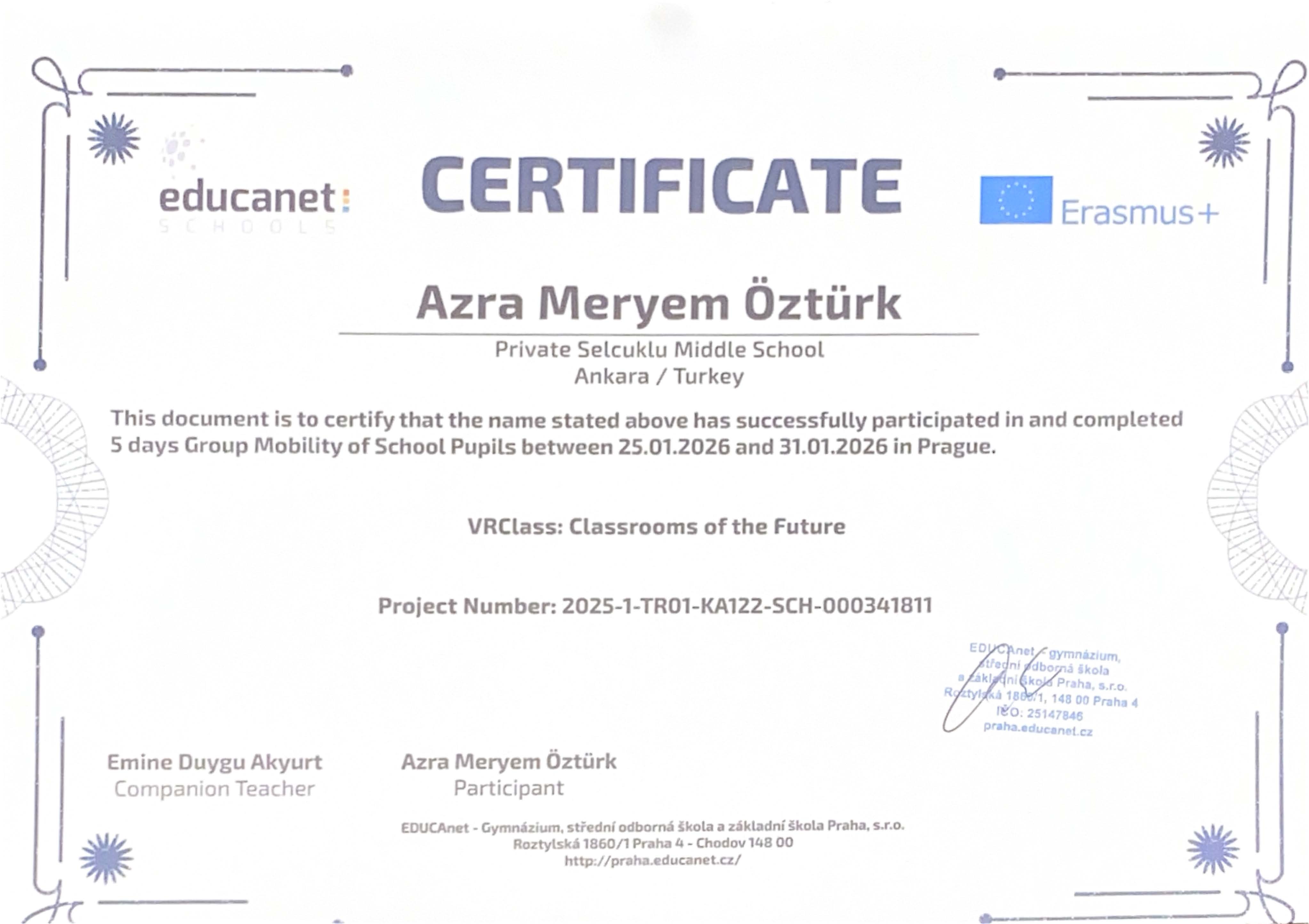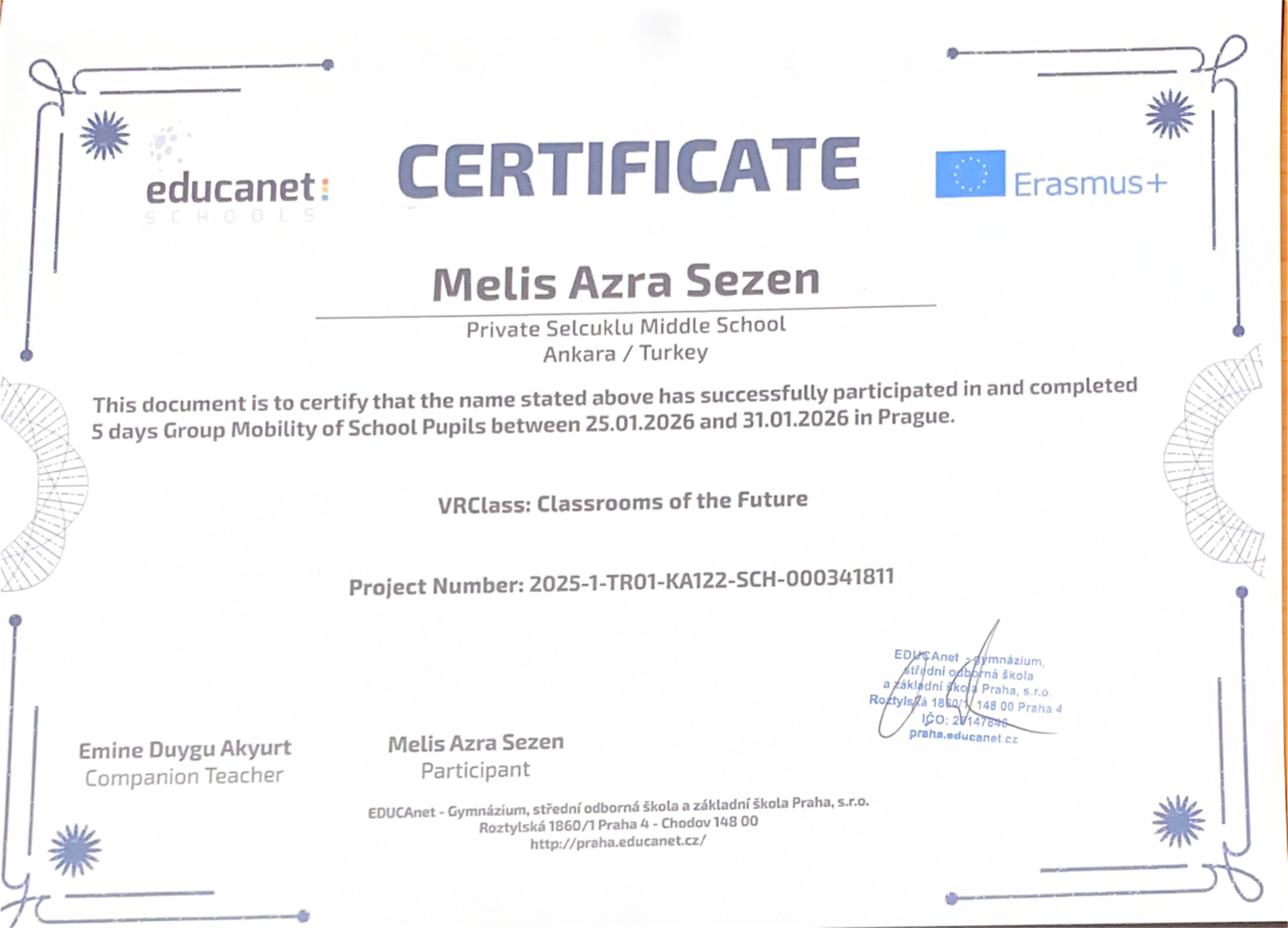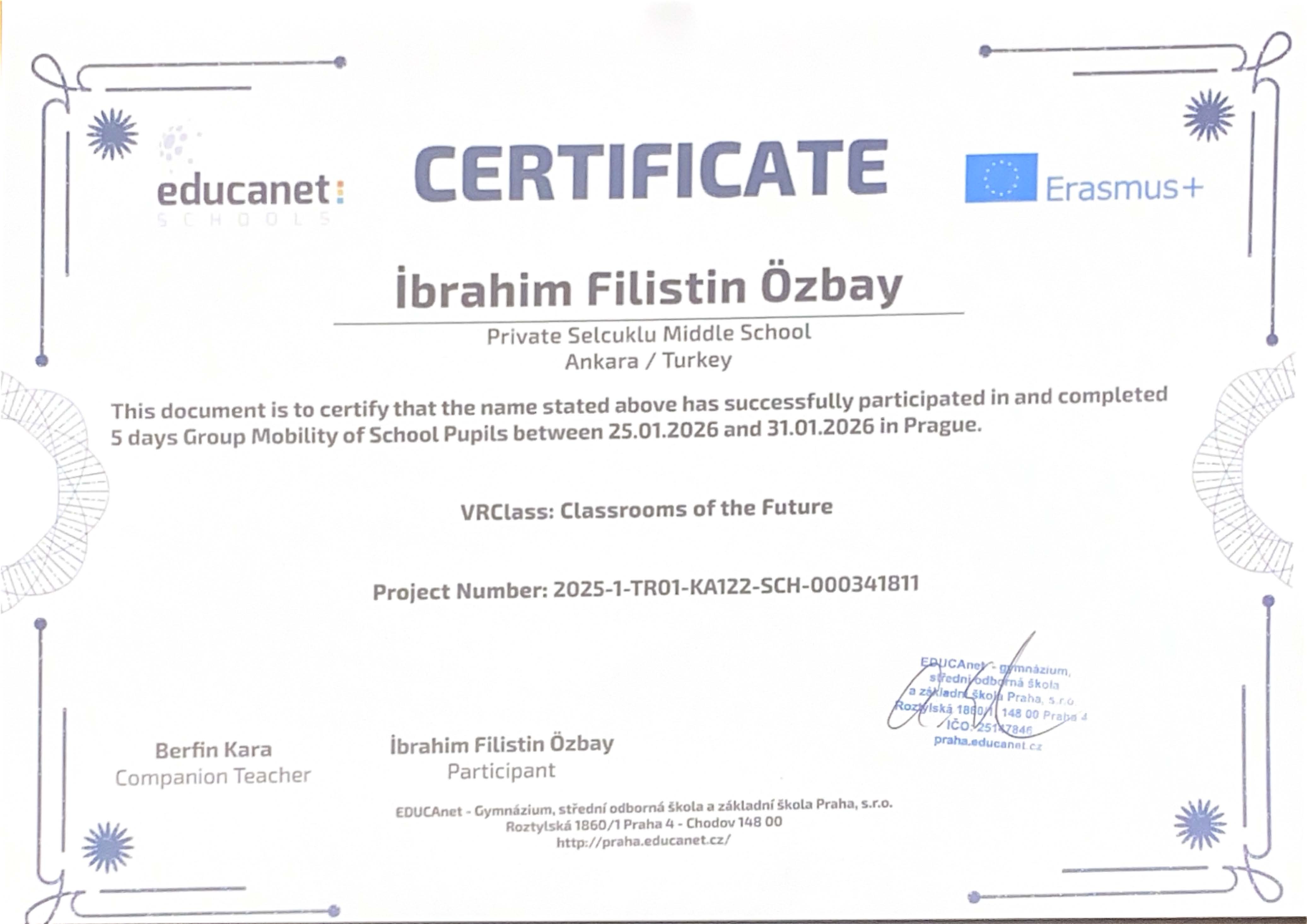 “VRClass: Classrooms of the Future” projesi kapsamında Prag’da gerçekleştirilen Erasmus+ Öğrenci Grup Hareketliliği ve İşbaşı Gözlem (Job Shadowing) faaliyetleri başarıyla tamamlanmıştır. Öğrencilerimiz, refakatçi yabancı dil rehber öğretmenlerimiz ve yöneticilerimiz, beş gün süren bu uluslararası öğrenme deneyimini Erasmus+ katılım sertifikalarıyla taçlandırmıştır.