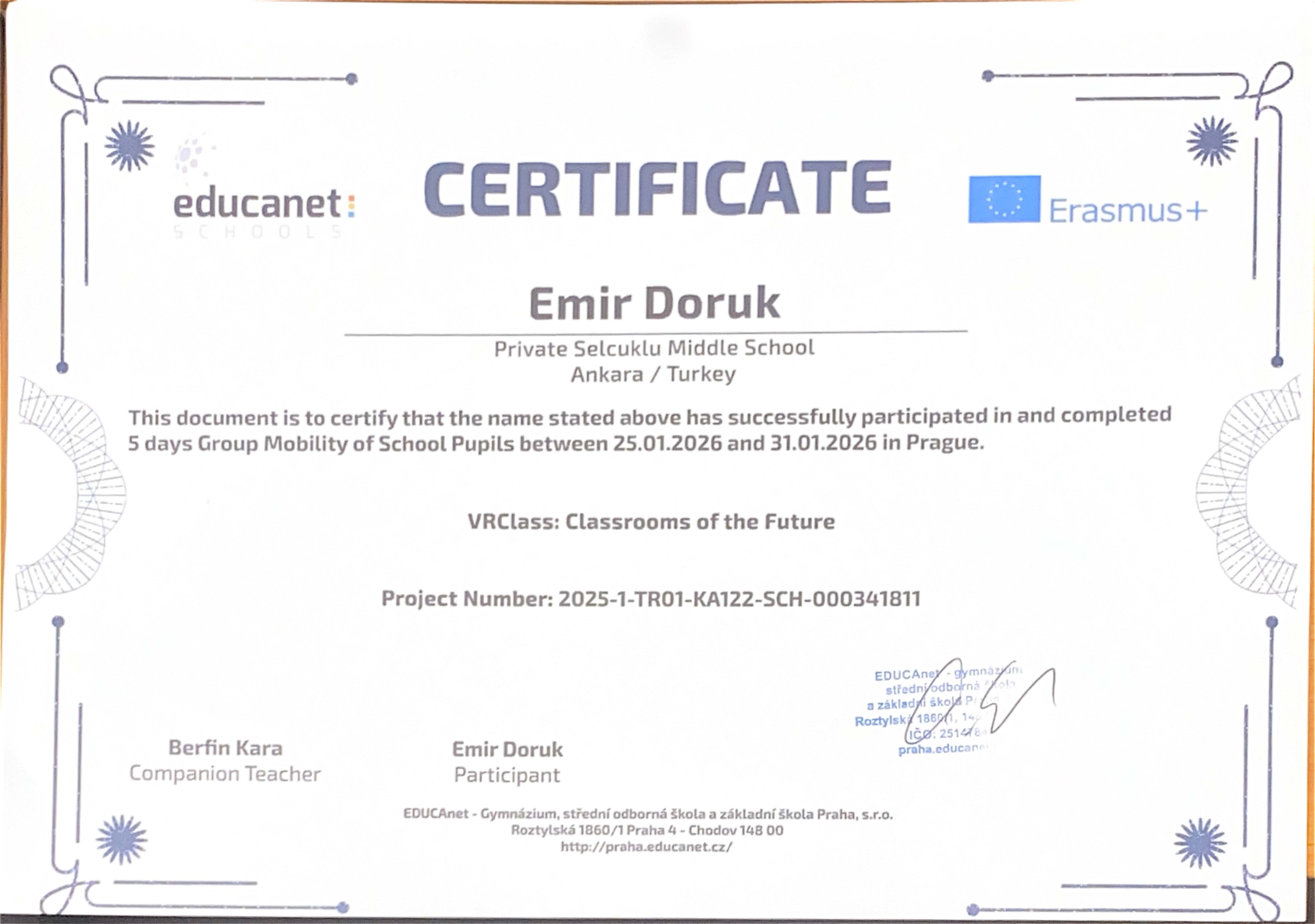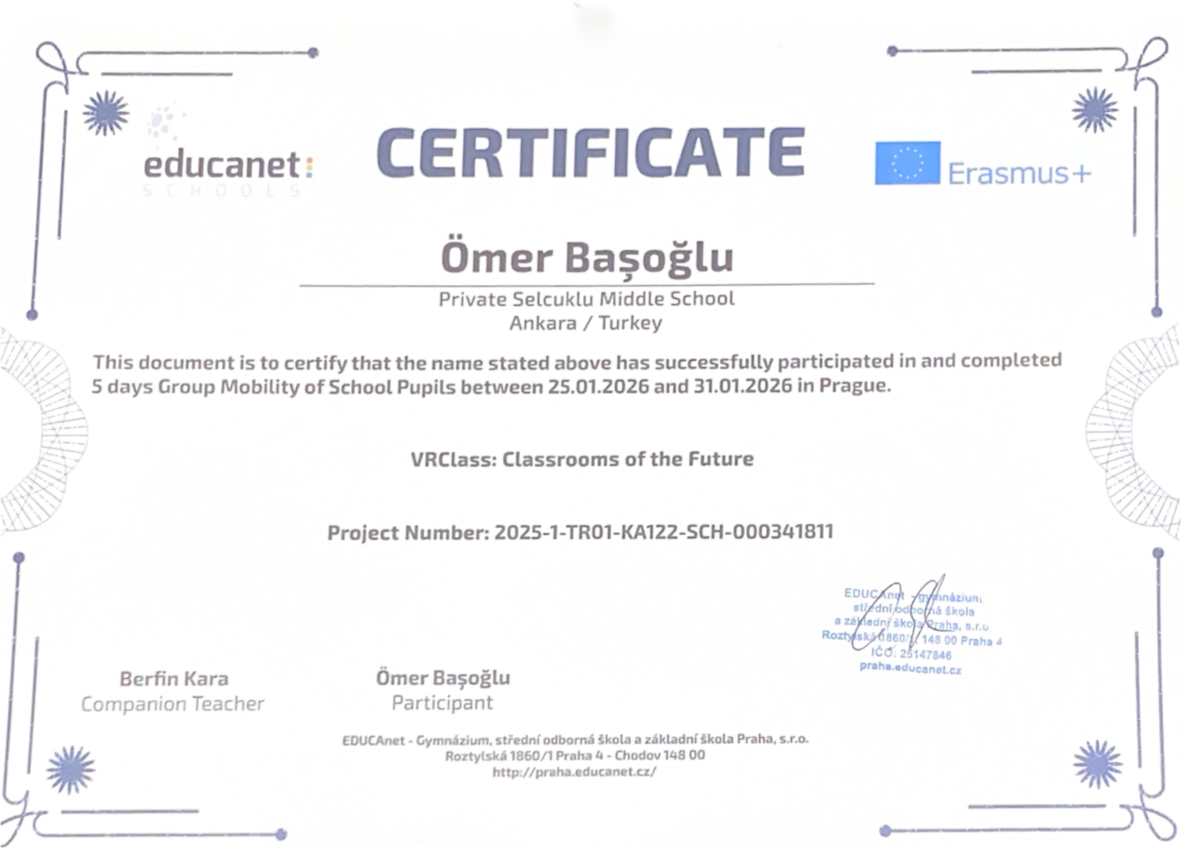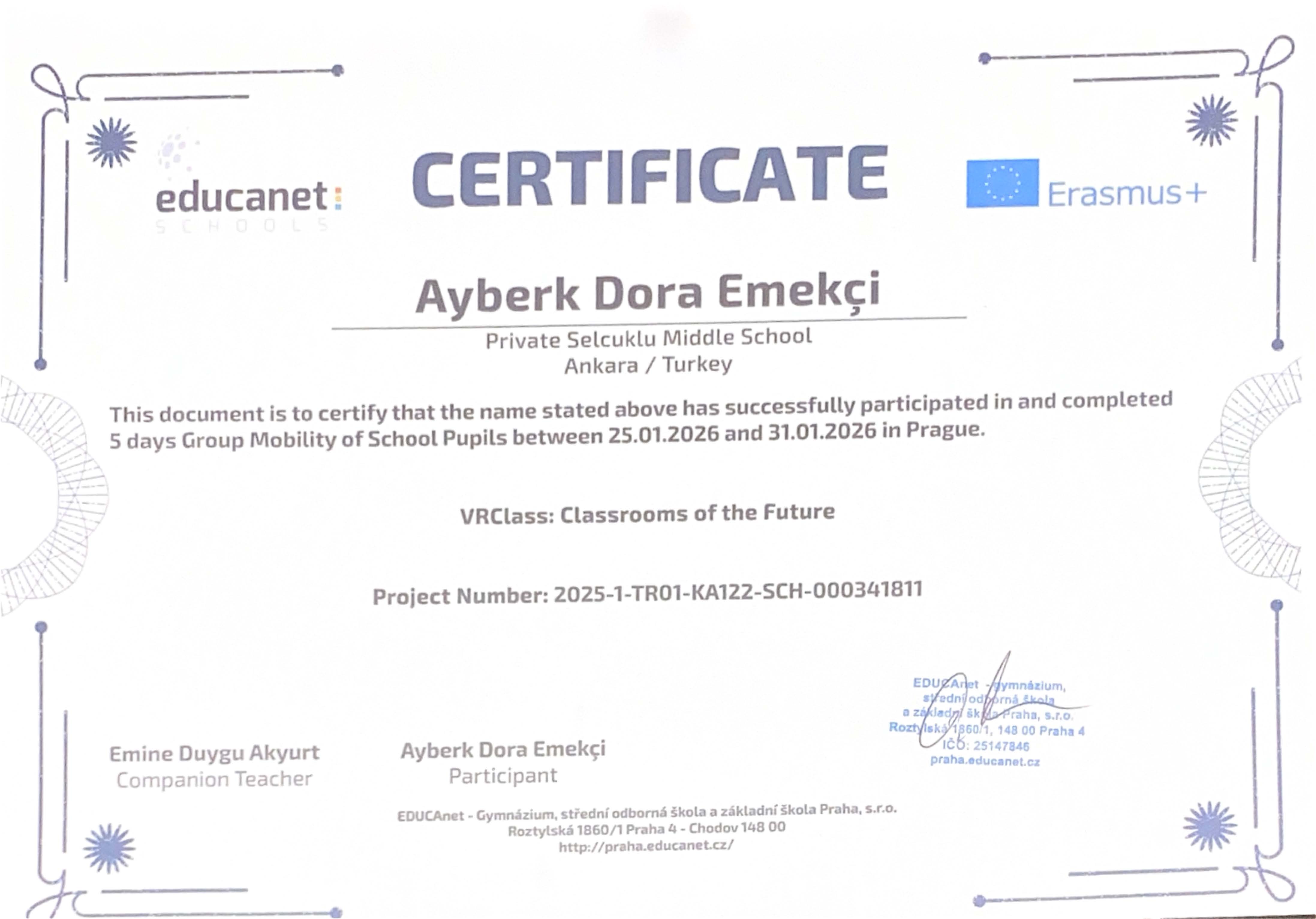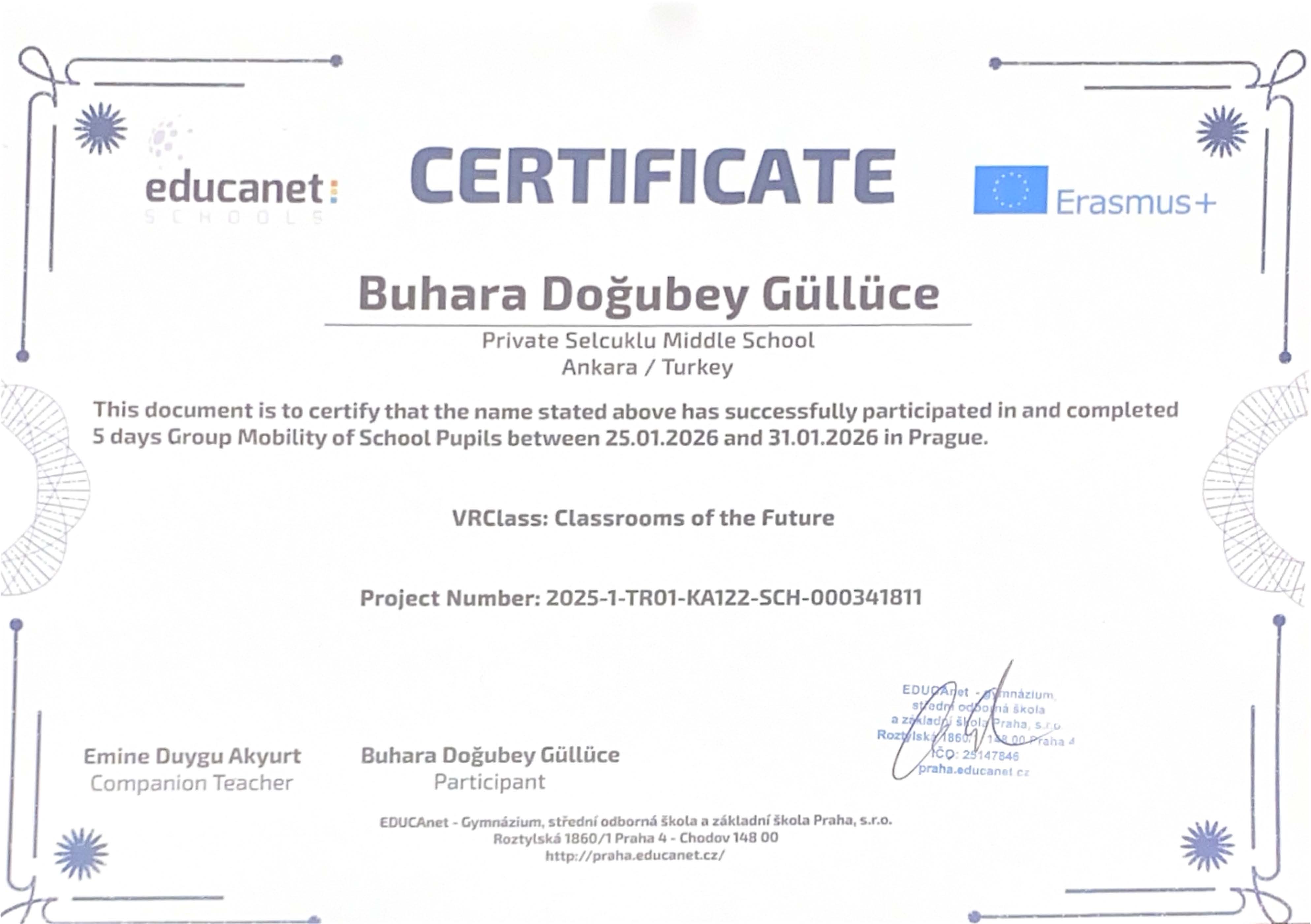 “VRClass: Classrooms of the Future” projesi kapsamında Prag’da gerçekleştirilen Erasmus+ Öğrenci Grup Hareketliliği ve İşbaşı Gözlem (Job Shadowing) faaliyetleri başarıyla tamamlanmıştır. Öğrencilerimiz, refakatçi yabancı dil rehber öğretmenlerimiz ve yöneticilerimiz, beş gün süren bu uluslararası öğrenme deneyimini Erasmus+ katılım sertifikalarıyla taçlandırmıştır.