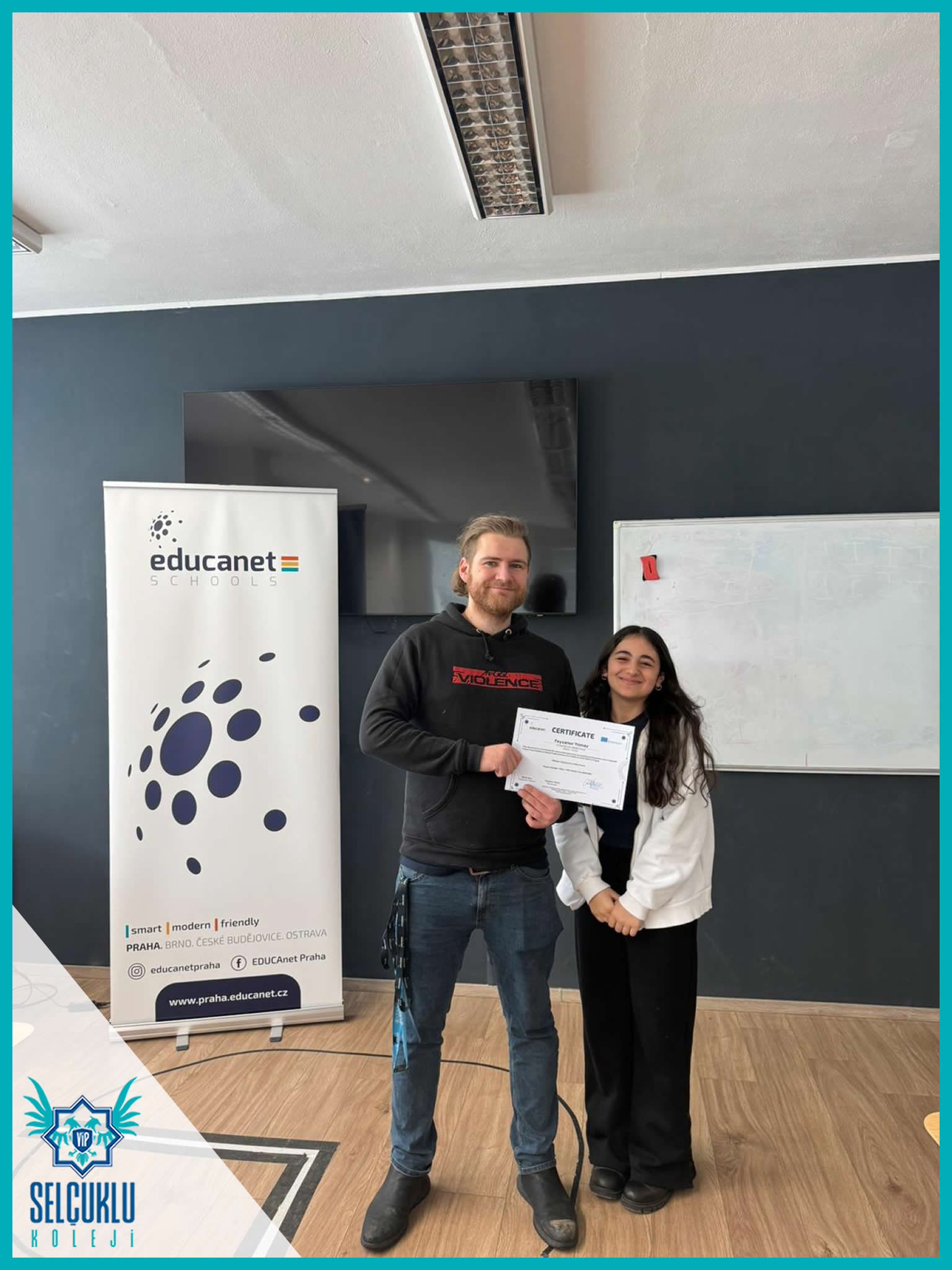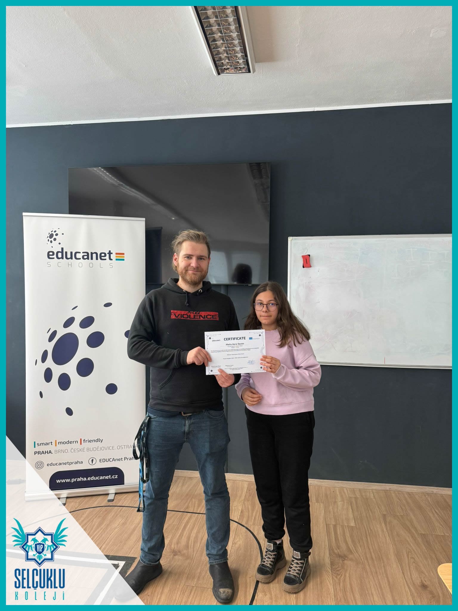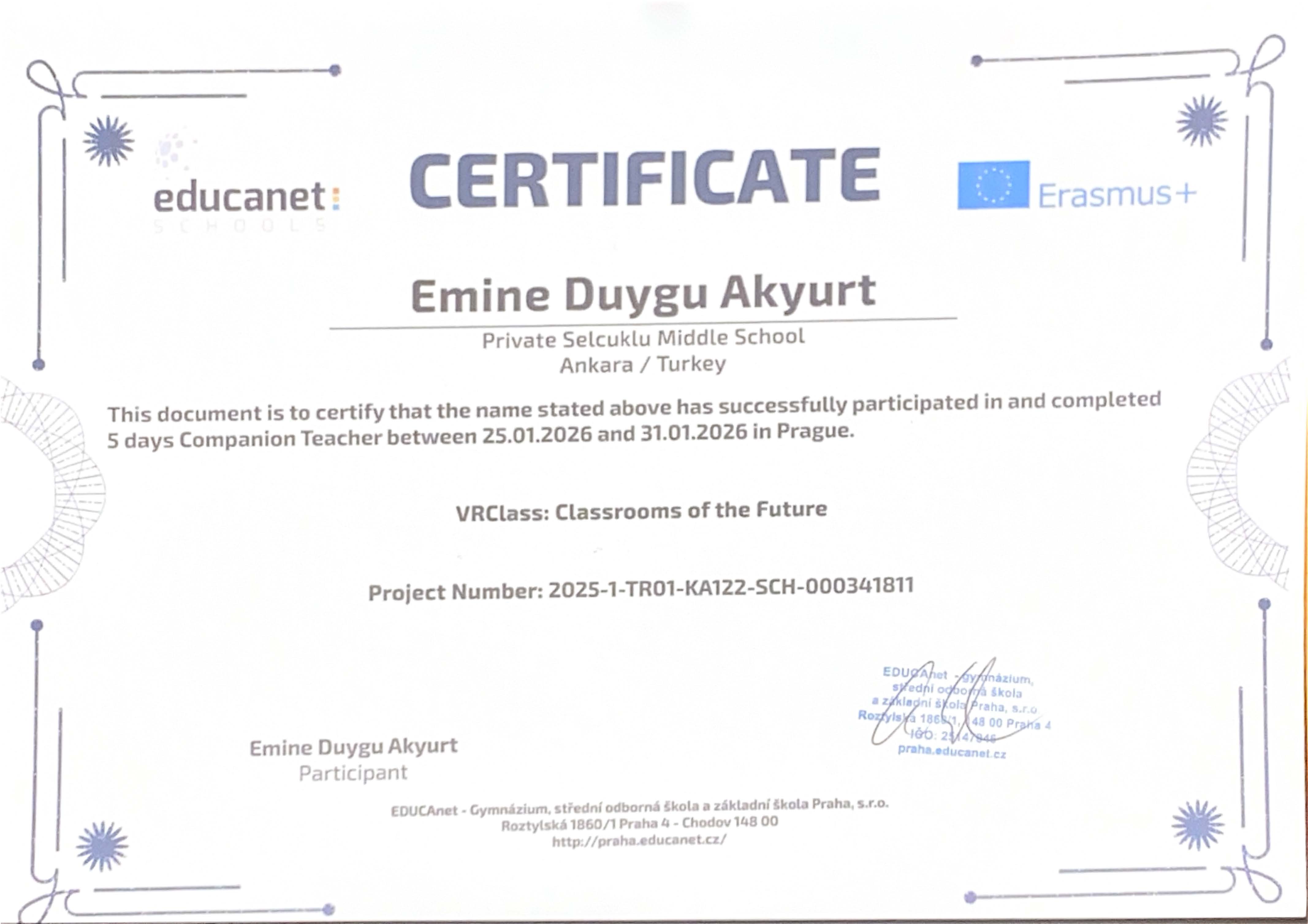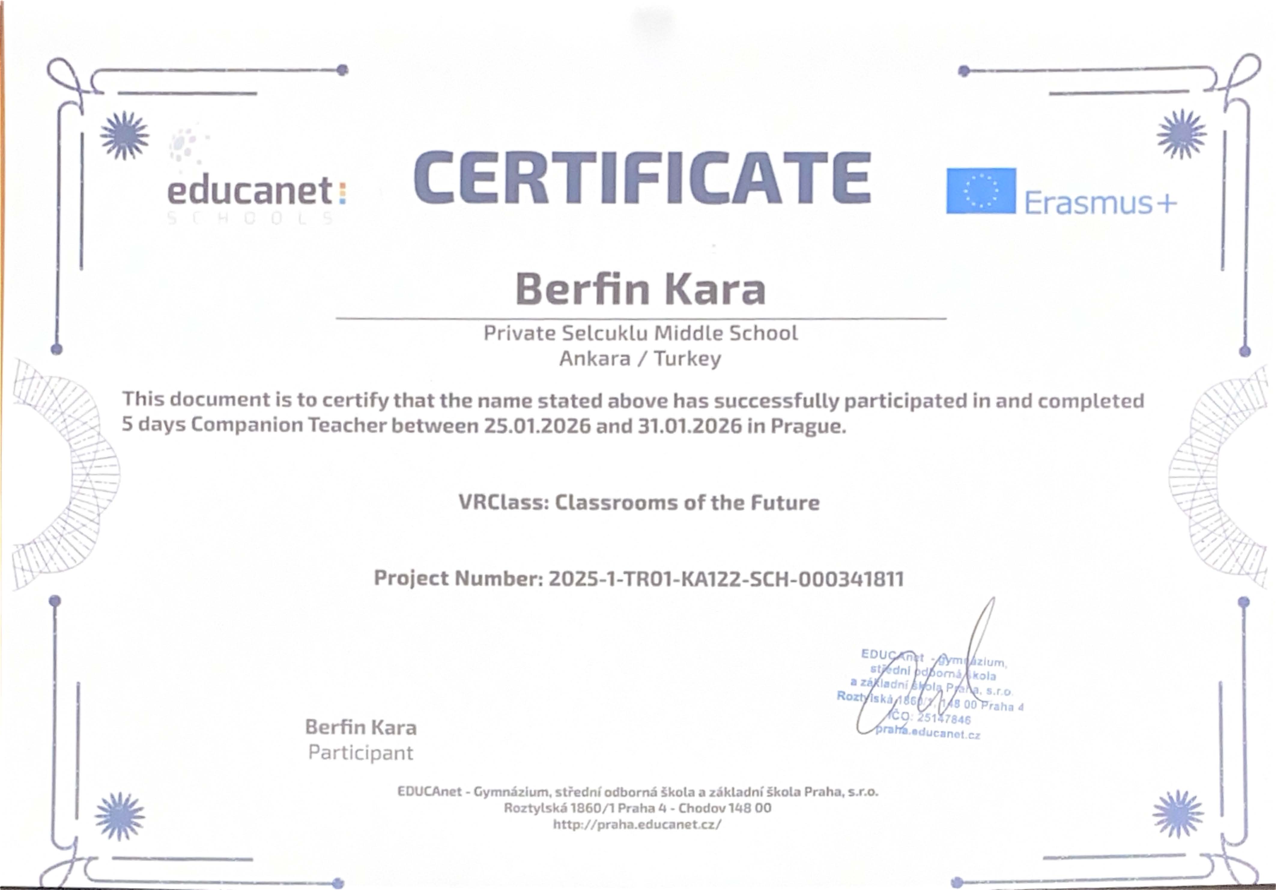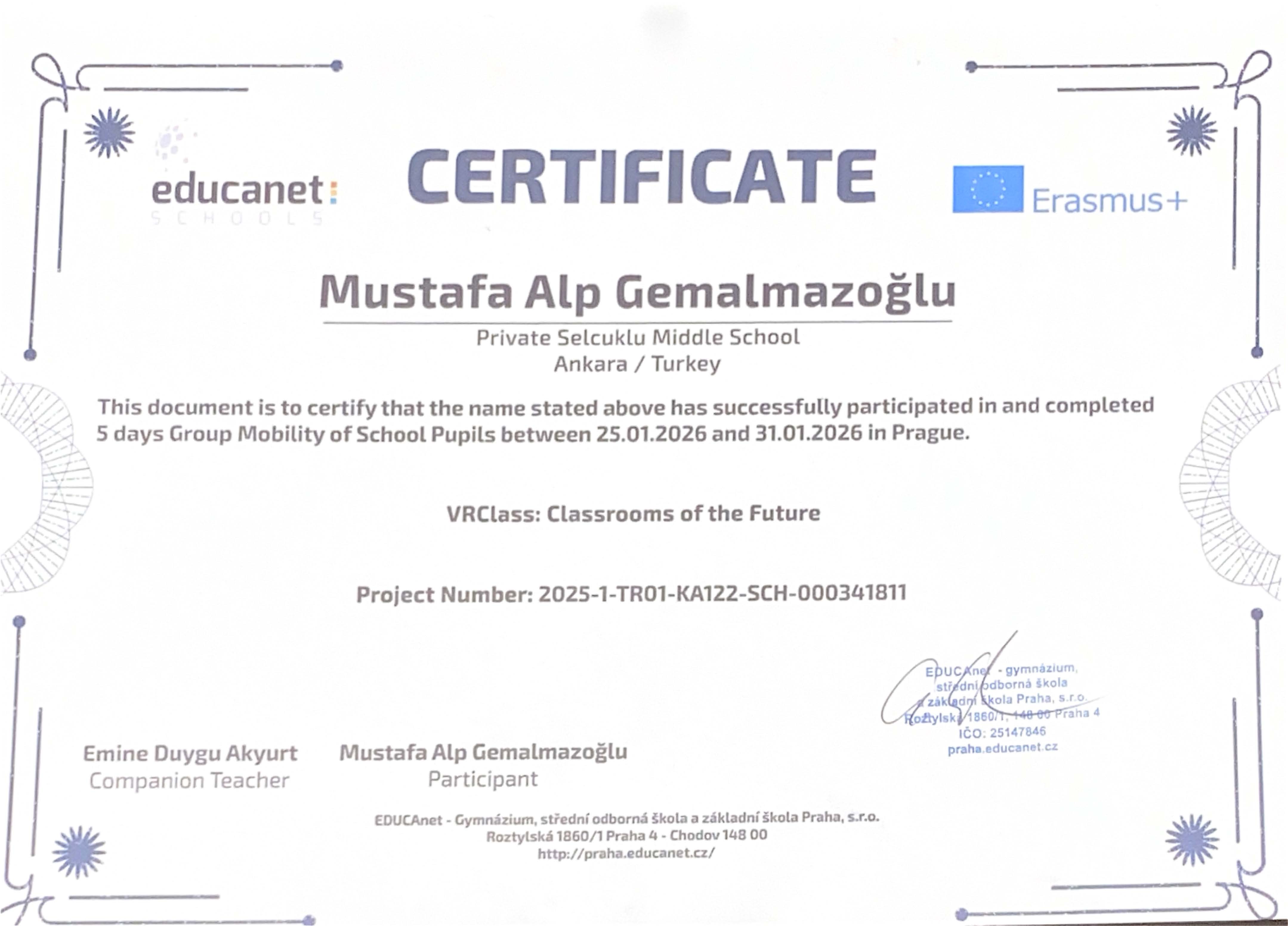 “VRClass: Classrooms of the Future” projesi kapsamında Prag’da gerçekleştirilen Erasmus+ Öğrenci Grup Hareketliliği ve İşbaşı Gözlem (Job Shadowing) faaliyetleri başarıyla tamamlanmıştır. Öğrencilerimiz, refakatçi yabancı dil rehber öğretmenlerimiz ve yöneticilerimiz, beş gün süren bu uluslararası öğrenme deneyimini Erasmus+ katılım sertifikalarıyla taçlandırmıştır.