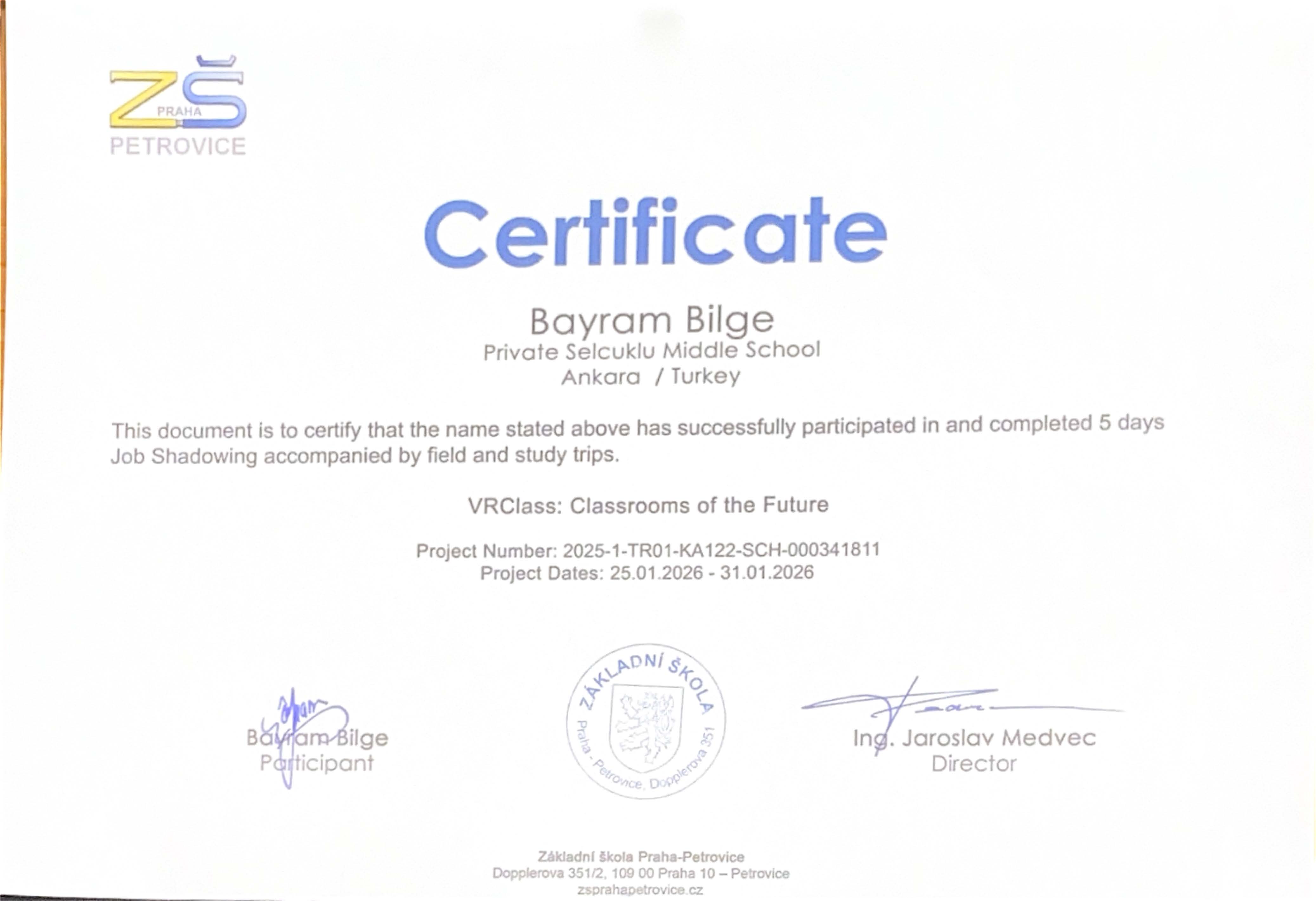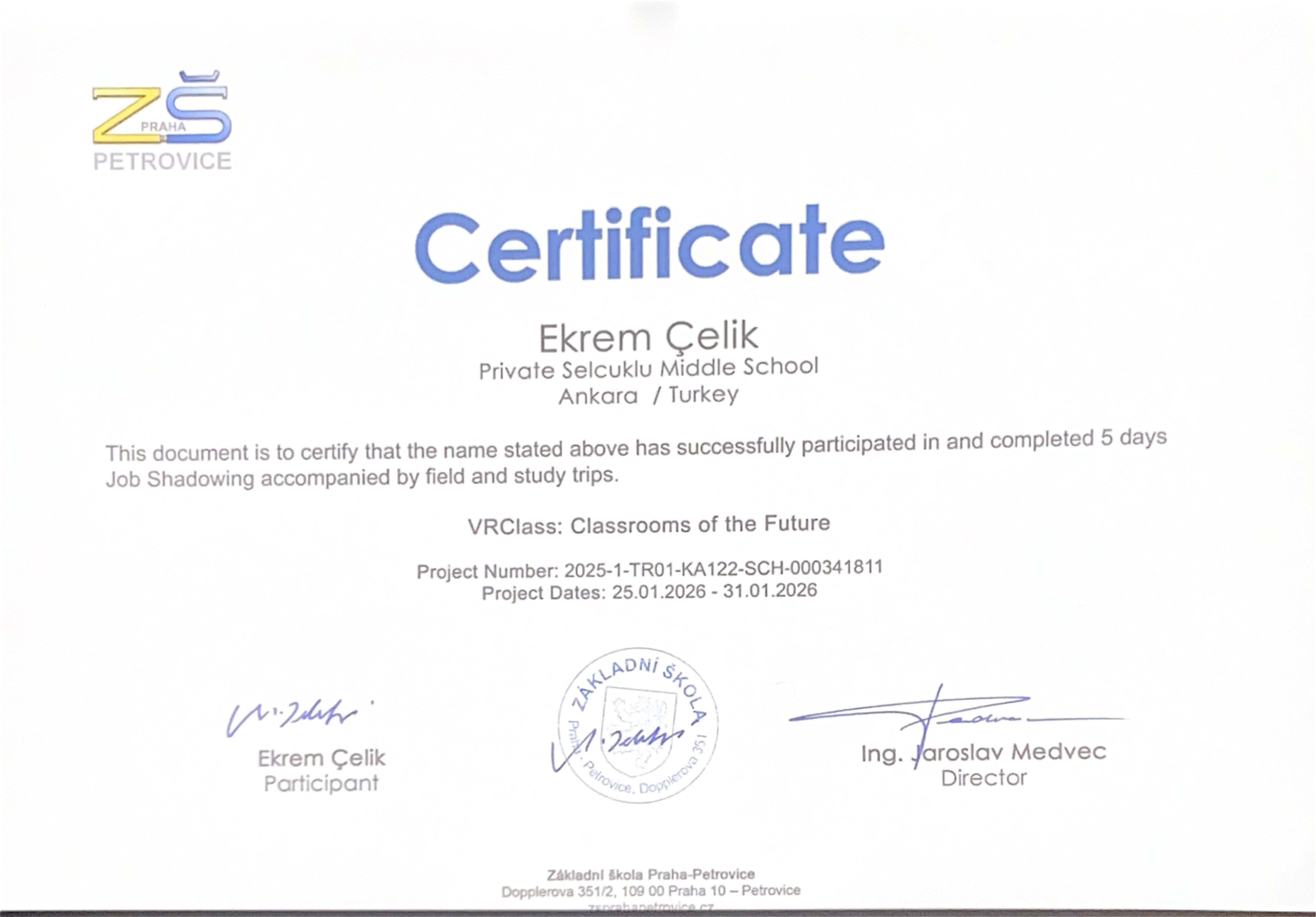 Aynı hareketlilik sürecinde, okul yöneticilerimiz Bayram Bilge ve Ekrem Çelik, Prag’da bulunan “Zakladní Škola” adlı eğitim kurumunda Erasmus+ İşbaşı Gözlem (Job Shadowing) faaliyetlerine katılmıştır. Beş gün süren bu faaliyet kapsamında yöneticilerimiz; ders gözlemleri, alan incelemeleri, eğitim uygulamalarına yönelik değerlendirmeler ile alan gezileri ve eğitim amaçlı ziyaretlerde bulunmuştur. İşbaşı gözlem faaliyetlerinin tamamlanmasının ardından, katılımcılara Erasmus+ Job Shadowing katılım sertifikaları ev sahibi kurum tarafından takdim edilmiştir.