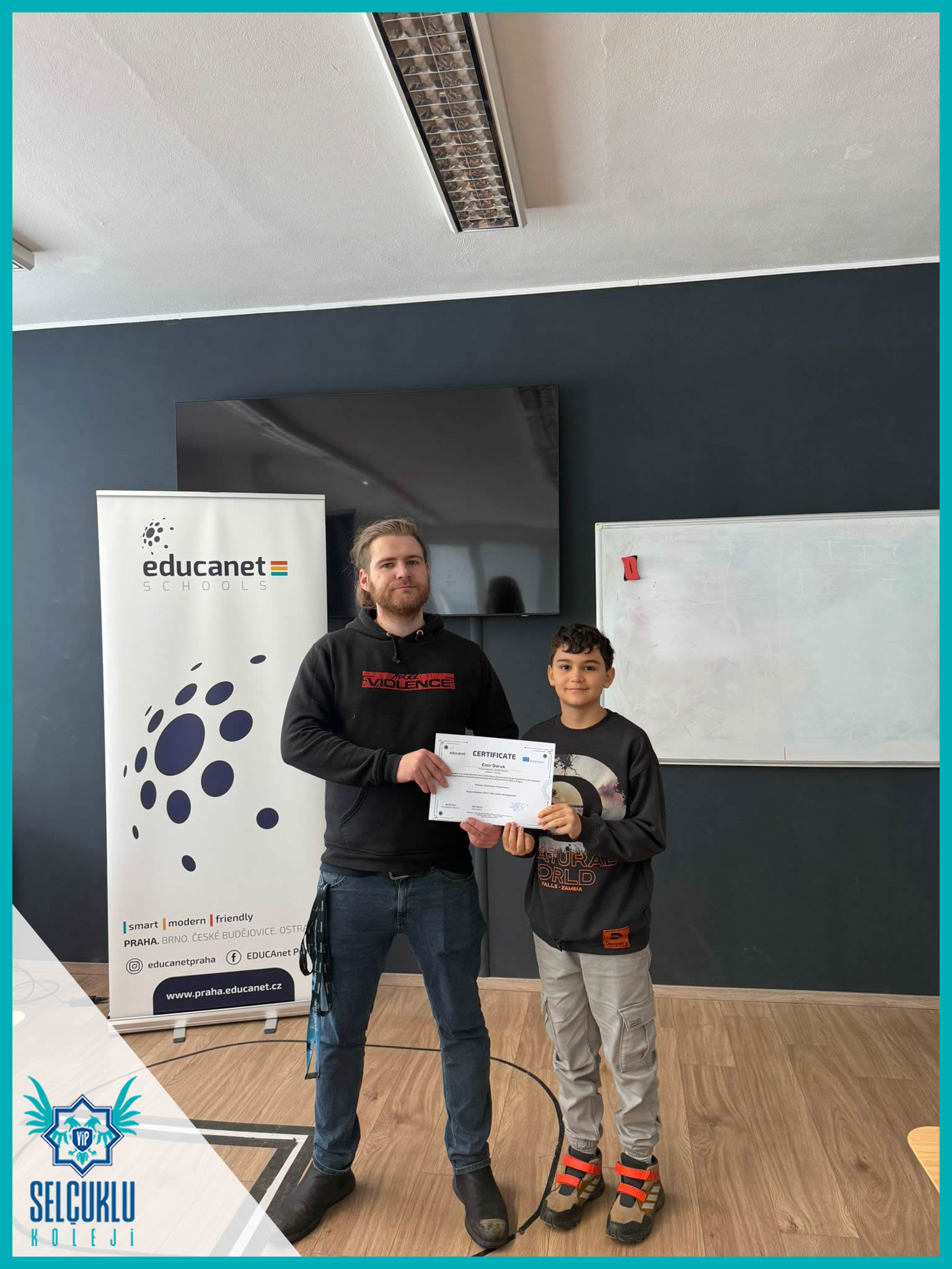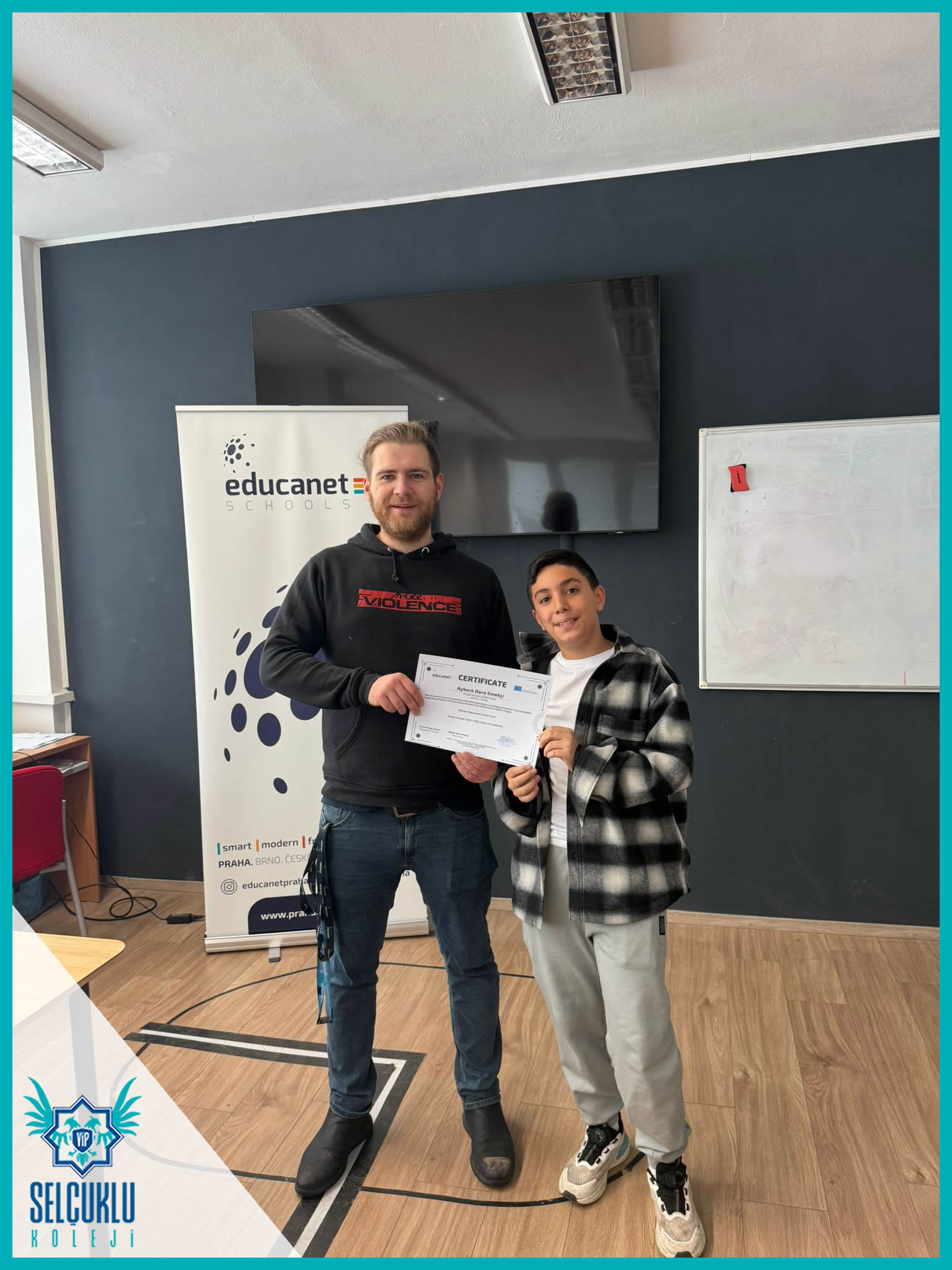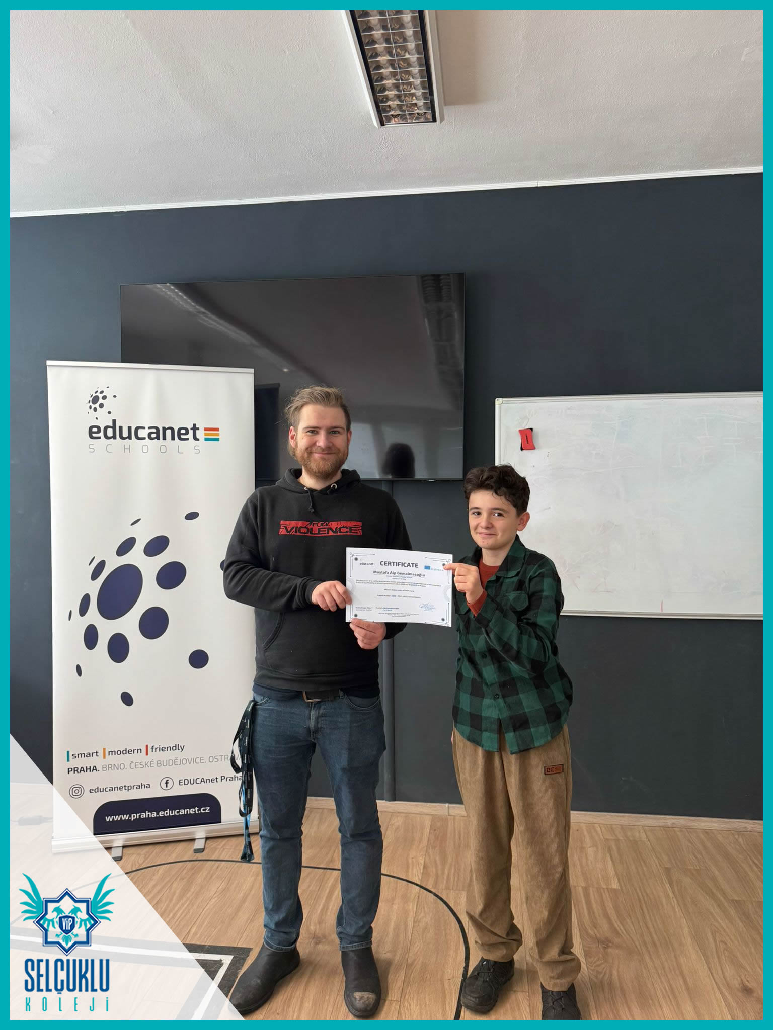 Sabah saatlerindeki okul gözlemlerinin ardından, grup hareketliliği kapsamında Edukanet okulunda görevlerini tamamlayan öğrencilerimiz ve refakatçi öğretmenlerimizle birlikte Erasmus+ sertifika törenimizi gerçekleştirdik. Uluslararası bir öğrenme sürecinin somut bir çıktısı olan sertifikalar, öğrencilerimiz için büyük bir gurur ve motivasyon kaynağı oldu. Sertifika töreniyle birlikte, emek verilen bir sürecin başarıyla tamamlanmış olmasının mutluluğunu hep birlikte yaşadık.